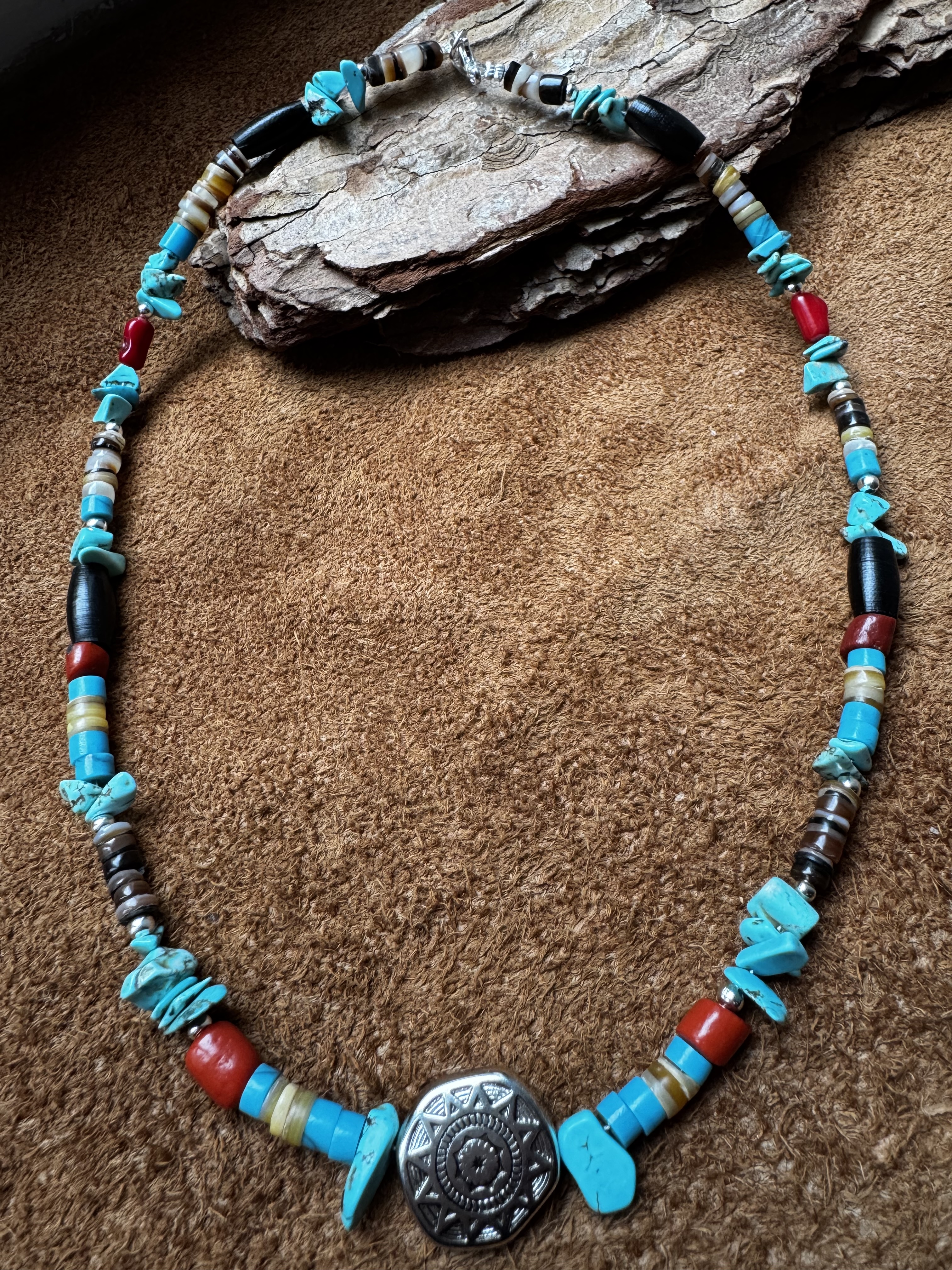 mit Türkis, Koralle, Muschelscheiben und Büffelhorn,